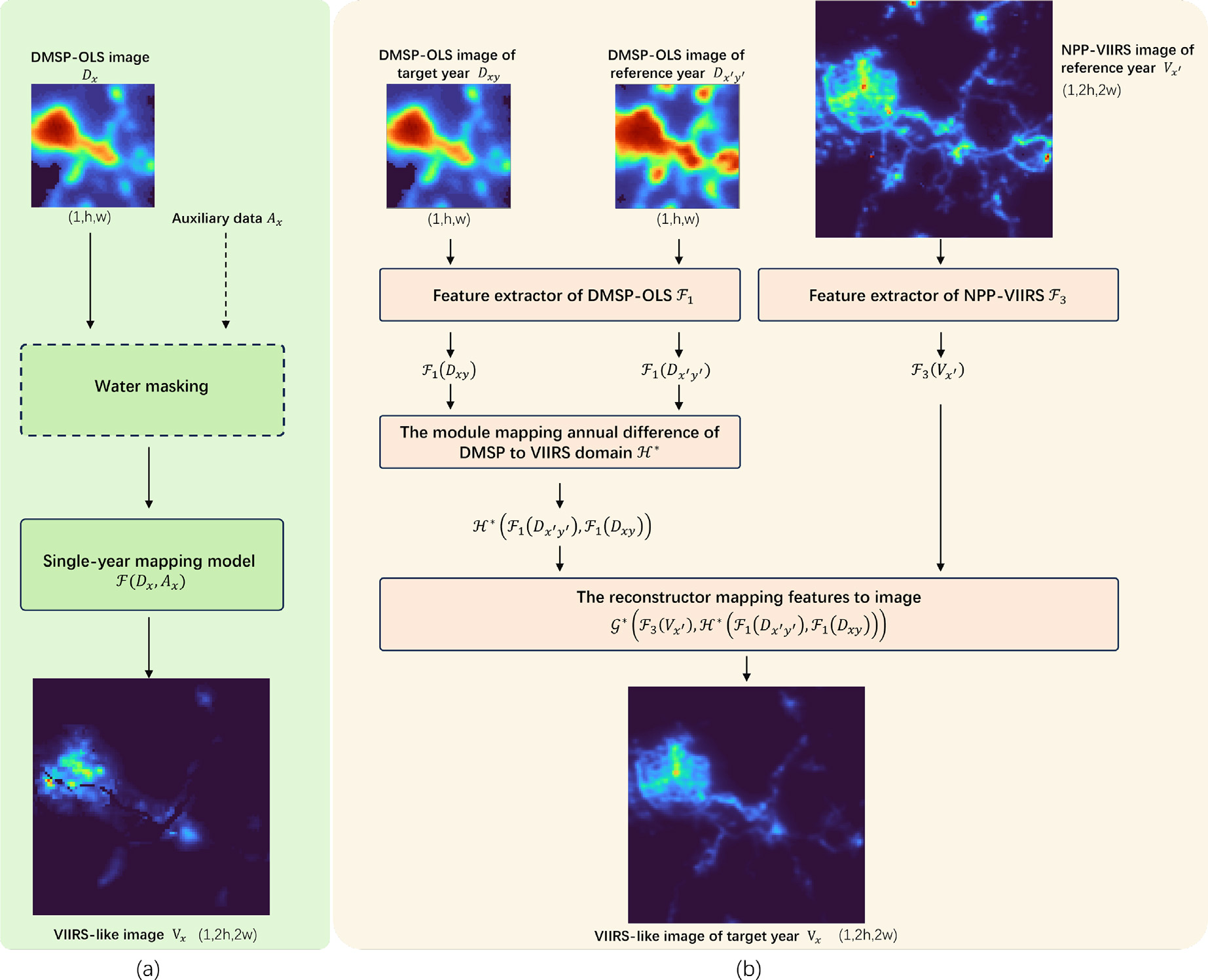 图2:模型架构对比。(a) 基于传统“单年映射”框架的DMSP-to-VIIRS重构任务; (b) 本研究提出的基于“学习年际差异”的DeepNTL模型。