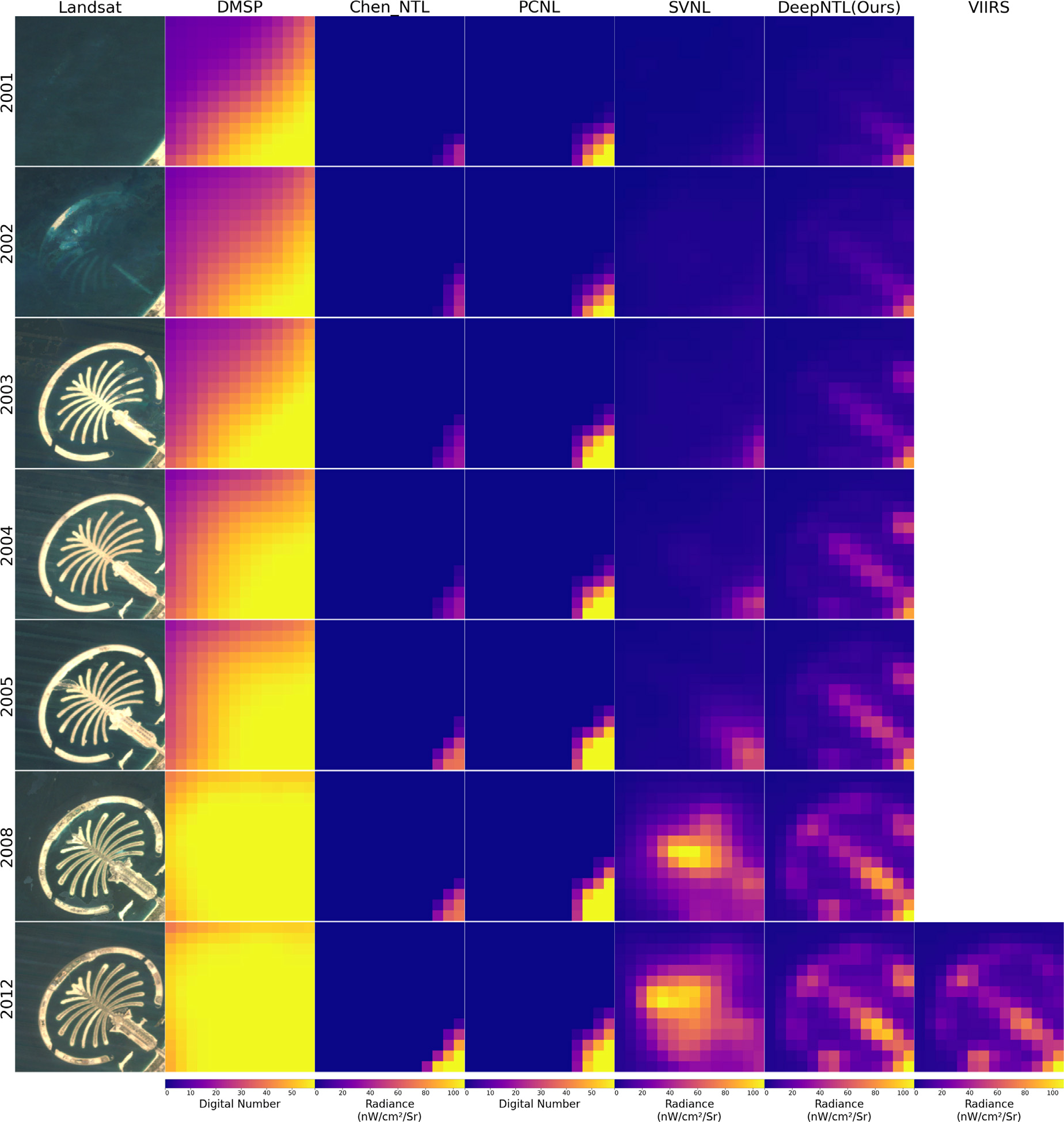 图3:迪拜棕榈朱美拉岛的夜光动态监测案例。第一列为2001年至2012年间的Landsat白昼影像,其余各列为对应年份的不同夜间灯光产品图像。其中,倒数第二列为本研究产生的DeepNTL数据,最后一列为自2012年起可获取的真实NPP-VIIRS影像。对比可见,只有DeepNTL清晰地还原了该人工岛屿从无到有的建设过程,并与真实NPP-VIIRS数据在形态和时序上高度一致。