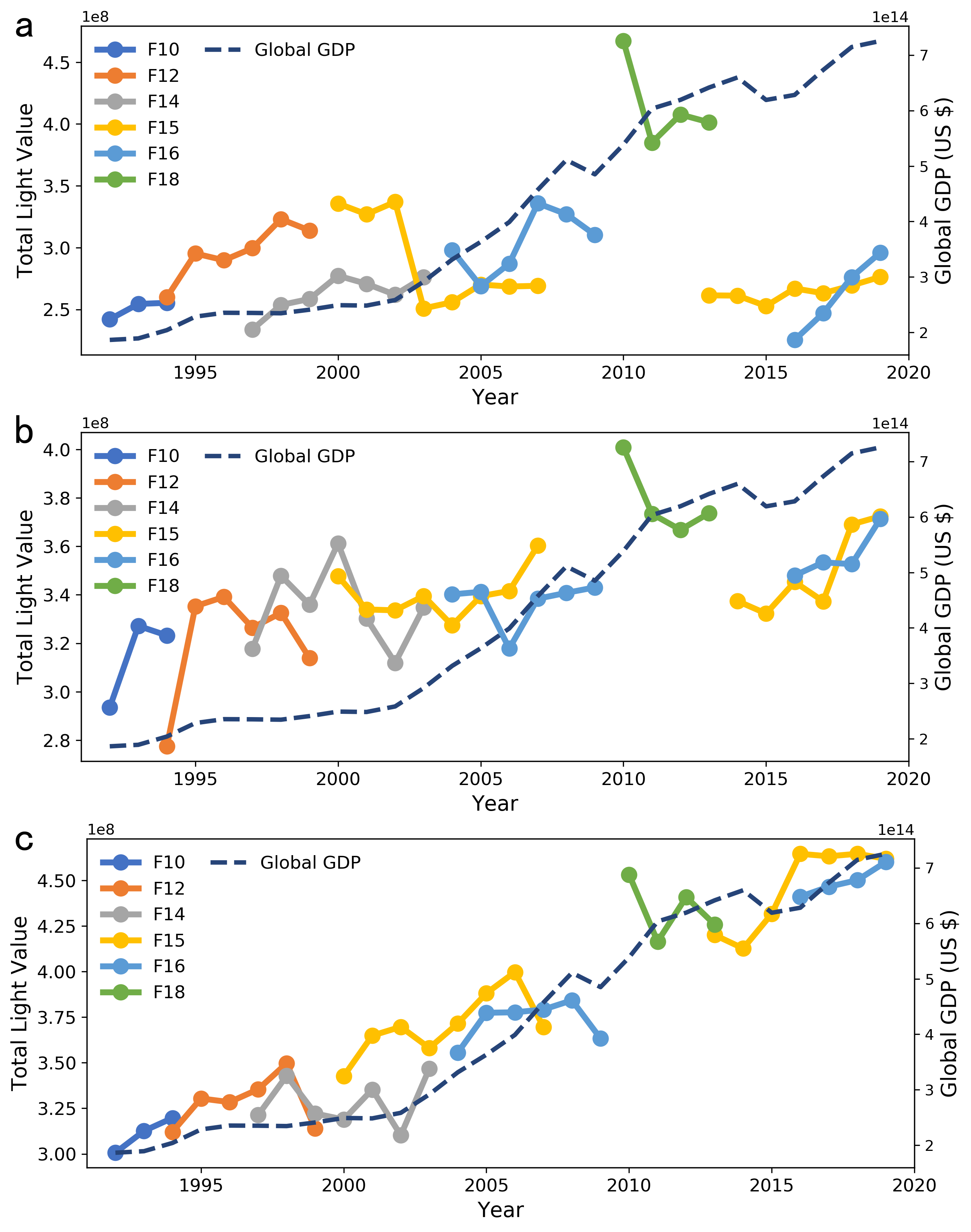 图1:数据定标结果对比。 (a) 原始DMSP-OLS数据集年度全球灯光总和; (b) 以Elvidge等人的方法定标的DMSP-OLS年度全球灯光总和;(c) 以我们提出的方法定标的DMSP-OLS年度全球灯光总和。其中的虚线表示全球GDP总量的增长趋势。对比可见,以我们的方法定标的灯光总量变化趋势更加贴合全球GDP的变化趋势,显著提升了数据的连续性。
