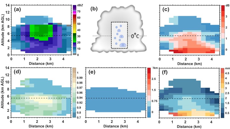 图2. 雷暴单体早期(case #1,17:24 CST)剖面展示,(a)ZH,(b)ZDR高值区域内微物理结构的概念模型,(c)ZDR,(d)CC,(e)KDP,(f)雨滴中值体积直径D0。黑色虚线表示0°C层高度。